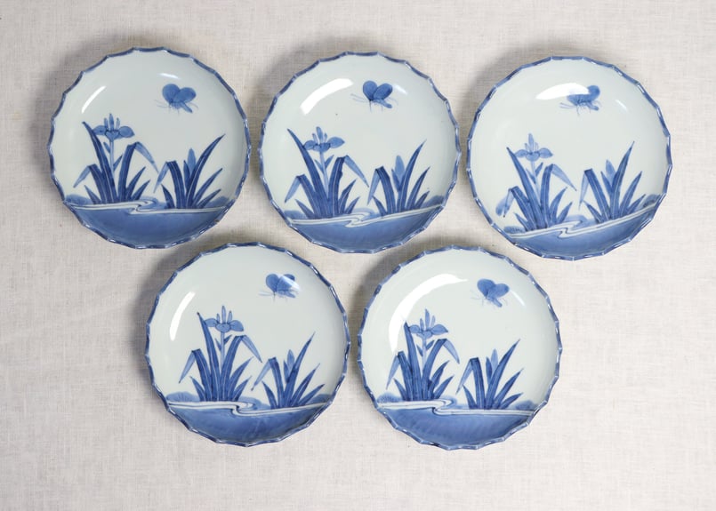 - 美術品・アンティーク・コレクション > 武具 > 江戸時代中期〜幕末期頃上級武家時代本歌八幡座付桔梗御家紋入大名陣笠当時物難有り品 江戸後期染付杜若と蝶図6寸皿 5客組 | 吉祥寺PukuPuku