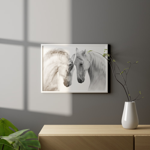 - 美術品・アンティーク・コレクション > 絵画 > 【送料無料】450×550 白馬 ホワイトホース 額付き アートポスター アートポスター 白馬 モノクロ 優雅 北欧風 自然美 動物アート