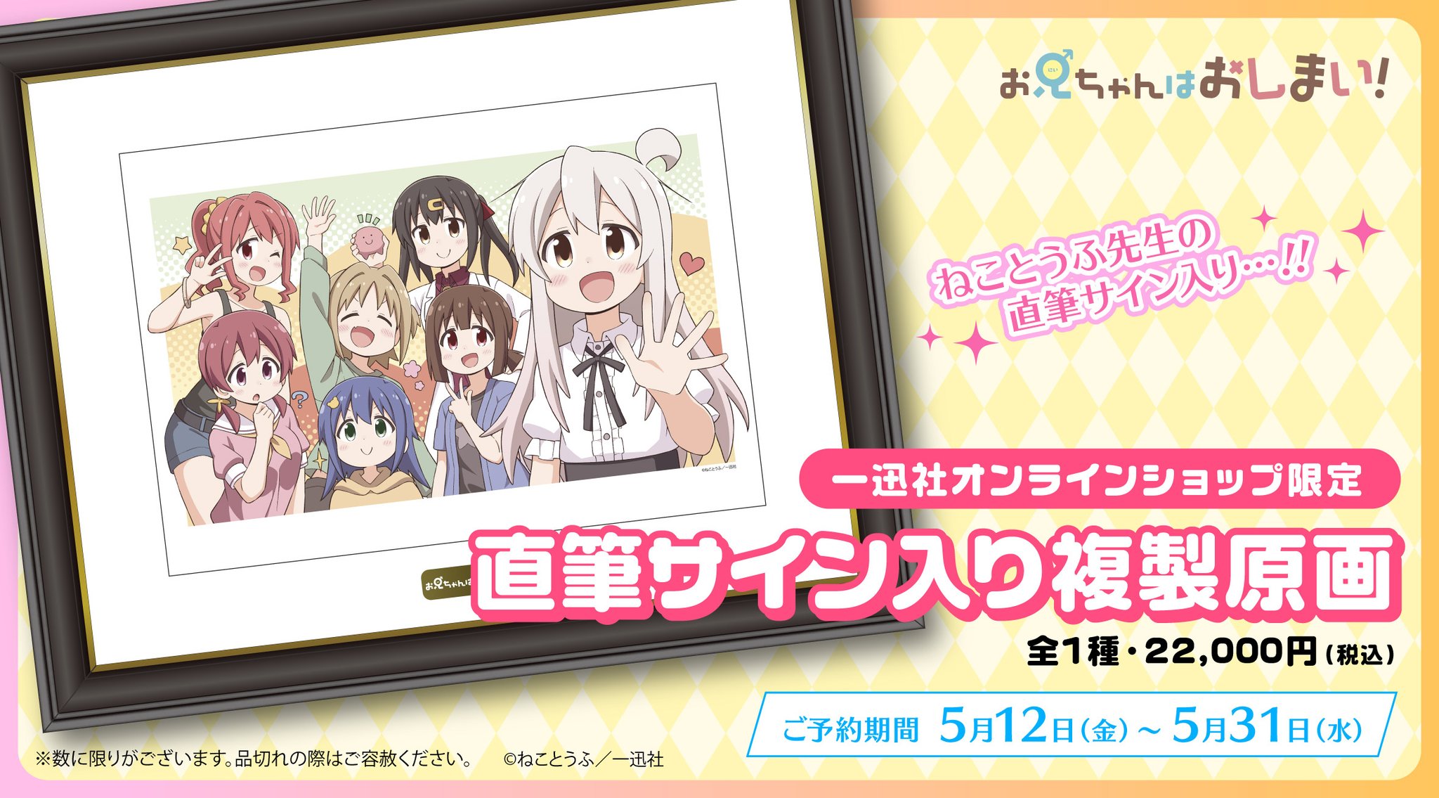 | 商品の特徴 | お兄ちゃんはおしまい! 直筆サイン入り 複製原画 (一迅社。お兄ちゃんはおしまい! 直筆サイン入り 複製原画 (一迅社。お兄ちゃんはおしまい!」より 作者ねことうふ氏直筆サイン入り。一度も飾らず暗所にて保管しておりました。【非売品】スクエニ ポイントラリーキャンペーン ポスターB2。お兄ちゃんはおしまい!(おにまい) | アニメイト。「お兄ちゃんはおしまい!」可愛らしいイラストを忠実に再現した複製原画が登場!ねことうふ先生の直筆サインを入れてお届けします。 | ||