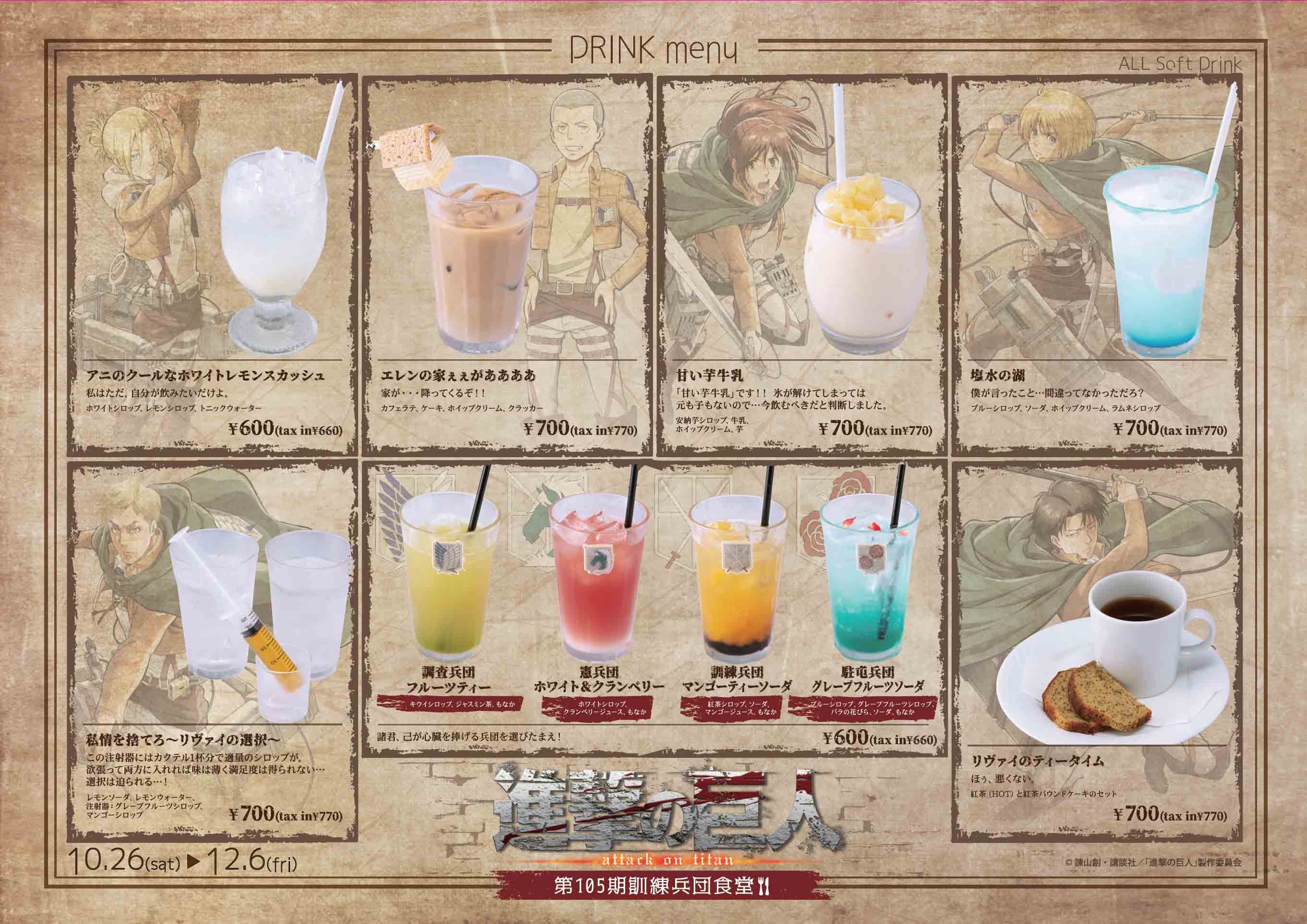 | メーカー | 第105期訓練兵団食堂 パセラコラボ 進撃の巨人「第105期訓練兵団食堂」OPEN |