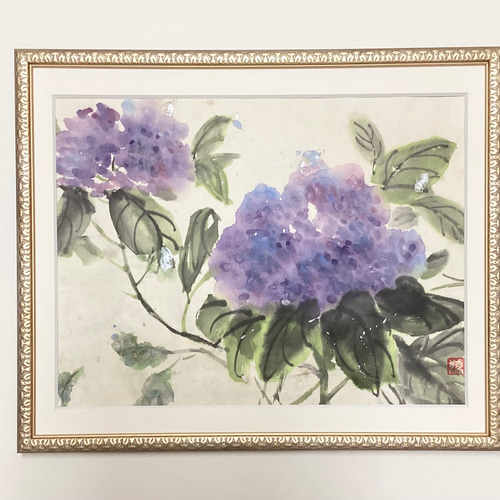 紫陽花〜大輪 絵画 墨絵 水墨画 墨彩画 インテリアアート 雑貨ギフト 紫色 5,500『Hydrangea〜紫陽花 』墨絵 水墨画 インテリアアート 雑貨